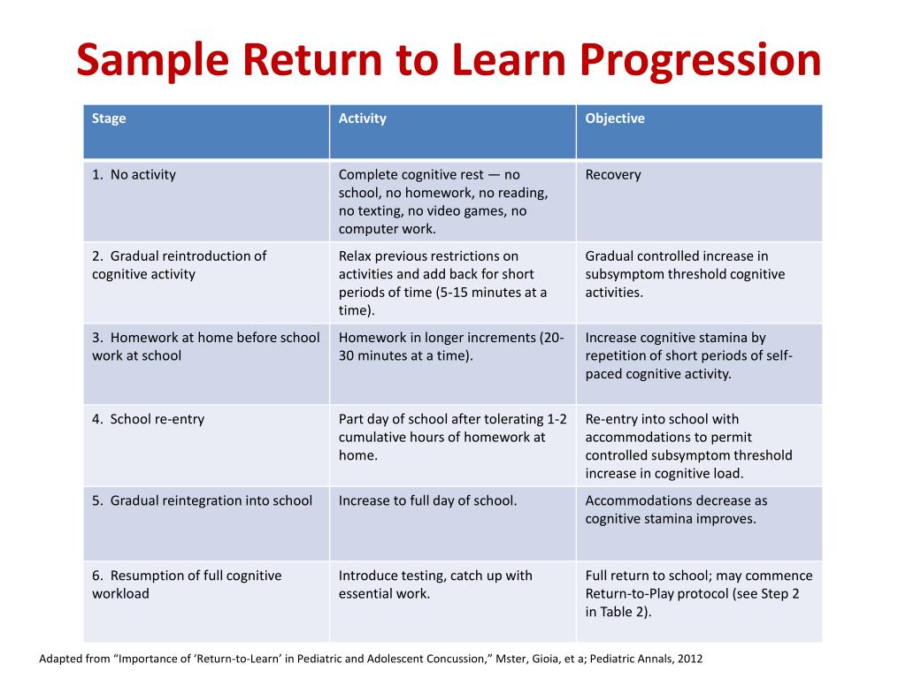 Sample Return to Learn Progression Adapted from “Importance of ‘Return-to-Learn’ in Pediatric and Adolescent Concussion,” Mster, Gioia, et a; Pediatric Annals, 2012