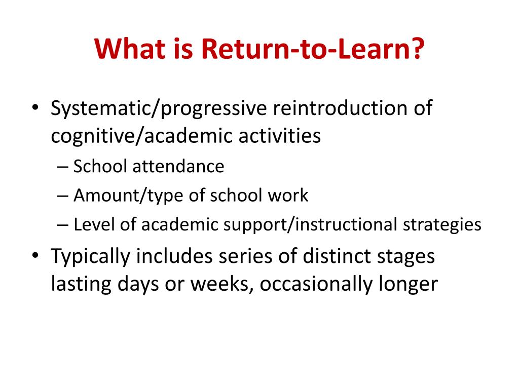What is Return-to-Learn? • Systematic/progressive reintroduction of cognitive/academic activities • School attendance • Amount/type of school work • Level of academic support/instructional strategies • Typically includes series of distinct stages lasting days or weeks, occasionally longer