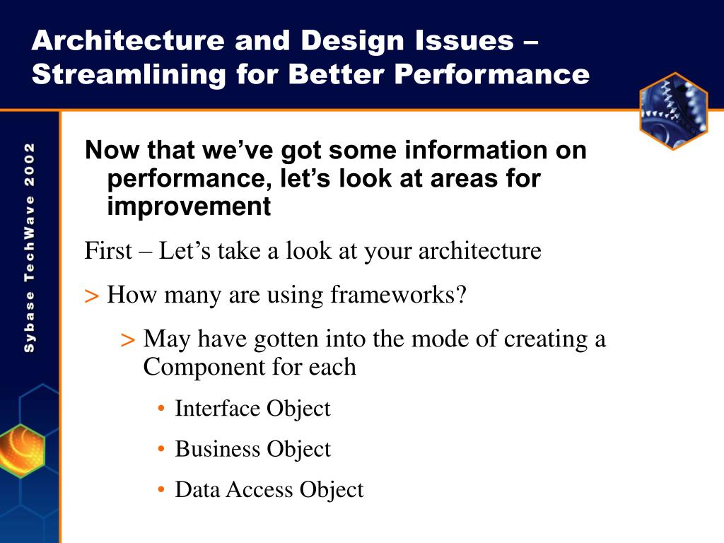 Architecture and Design Issues – Streamlining for Better Performance Now that we’ve got some information on performance, let’s look at areas for improvement First – Let’s take a look at your architecture • How many are using frameworks? • May have gotten into the mode of creating a Component for each • Interface Object • Business Object • Data Access Object