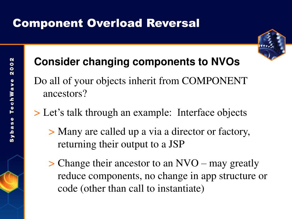 Component Overload Reversal Consider changing components to NVOs Do all of your objects inherit from COMPONENT ancestors? • Let’s talk through an example: Interface objects • Many are called up a via a director or factory, returning their output to a JSP • Change their ancestor to an NVO – may greatly reduce components, no change in app structure or code (other than call to instantiate)