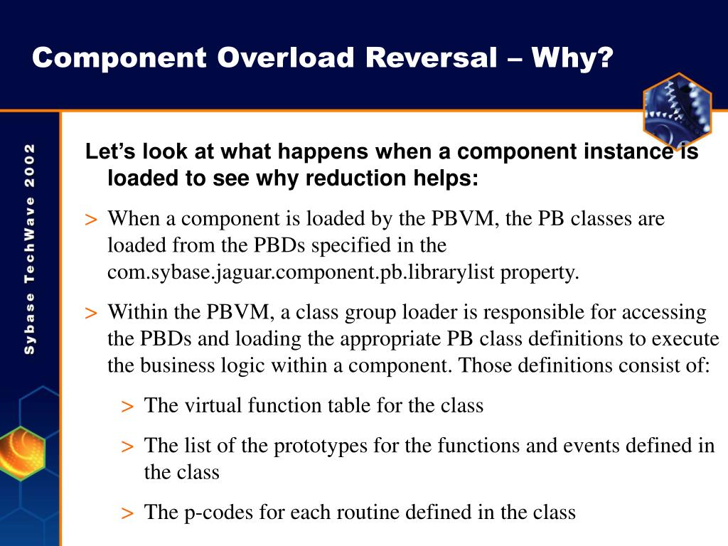 Component Overload Reversal – Why? Let’s look at what happens when a component instance is loaded to see why reduction helps: • When a component is loaded by the PBVM, the PB classes are loaded from the PBDs specified in the com.sybase.jaguar.component.pb.librarylist property. • Within the PBVM, a class group loader is responsible for accessing the PBDs and loading the appropriate PB class definitions to execute the business logic within a component. Those definitions consist of: • The virtual function table for the class • The list of the prototypes for the functions and events defined in the class • The p-codes for each routine defined in the class