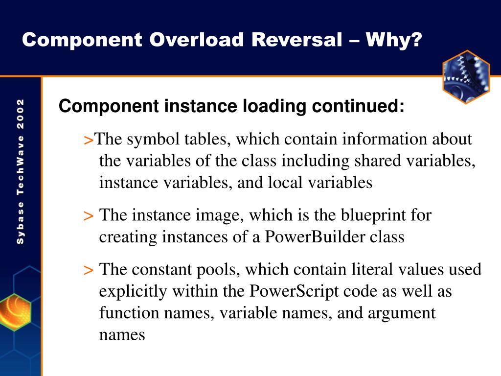 Component Overload Reversal – Why? Component instance loading continued: >The symbol tables, which contain information about the variables of the class including shared variables, instance variables, and local variables • The instance image, which is the blueprint for creating instances of a PowerBuilder class • The constant pools, which contain literal values used explicitly within the PowerScript code as well as function names, variable names, and argument names