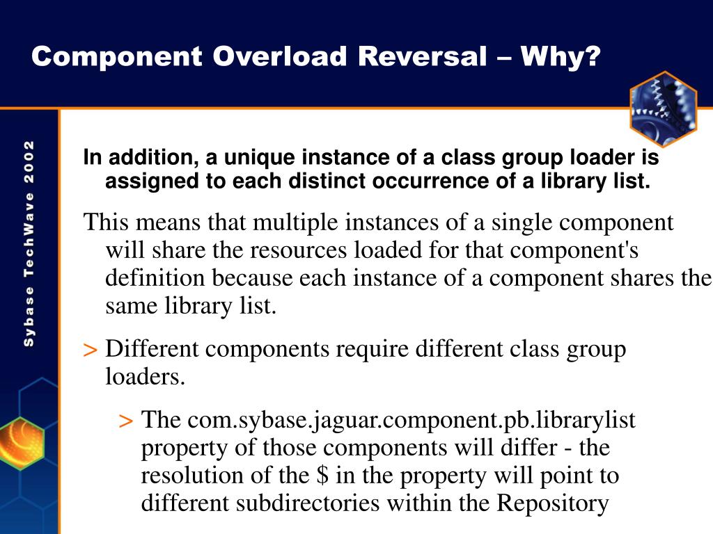 Component Overload Reversal – Why? In addition, a unique instance of a class group loader is assigned to each distinct occurrence of a library list. This means that multiple instances of a single component will share the resources loaded for that component's definition because each instance of a component shares the same library list. • Different components require different class group loaders. • The com.sybase.jaguar.component.pb.librarylist property of those components will differ - the resolution of the $ in the property will point to different subdirectories within the Repository