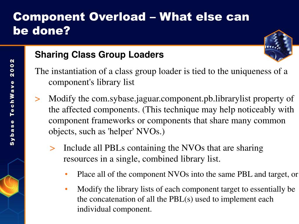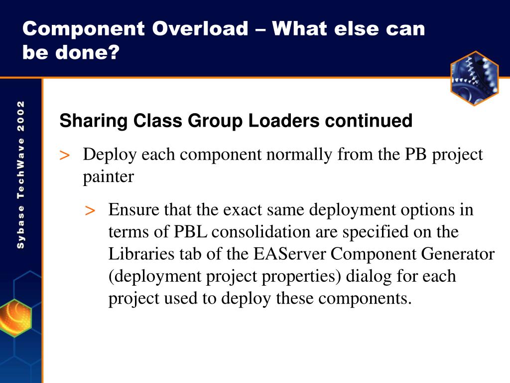 Component Overload – What else can be done? Sharing Class Group Loaders continued • Deploy each component normally from the PB project painter • Ensure that the exact same deployment options in terms of PBL consolidation are specified on the Libraries tab of the EAServer Component Generator (deployment project properties) dialog for each project used to deploy these components.