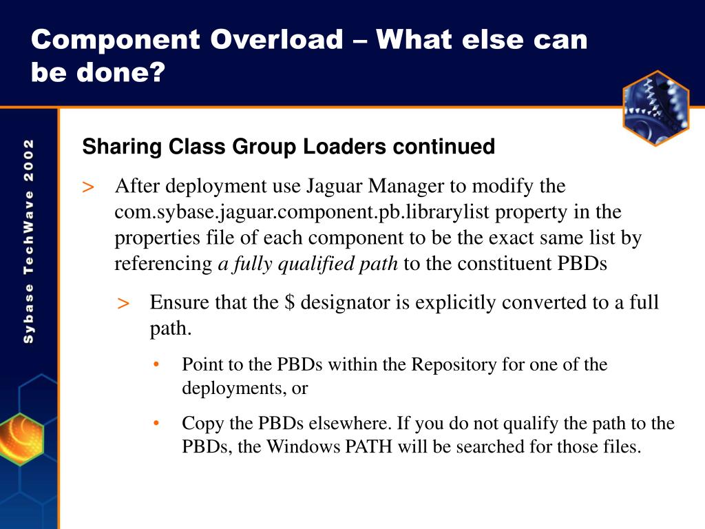 Component Overload – What else can be done? Sharing Class Group Loaders continued • After deployment use Jaguar Manager to modify the com.sybase.jaguar.component.pb.librarylist property in the properties file of each component to be the exact same list by referencing a fully qualified path to the constituent PBDs • Ensure that the $ designator is explicitly converted to a full path. • Point to the PBDs within the Repository for one of the deployments, or • Copy the PBDs elsewhere. If you do not qualify the path to the PBDs, the Windows PATH will be searched for those files.