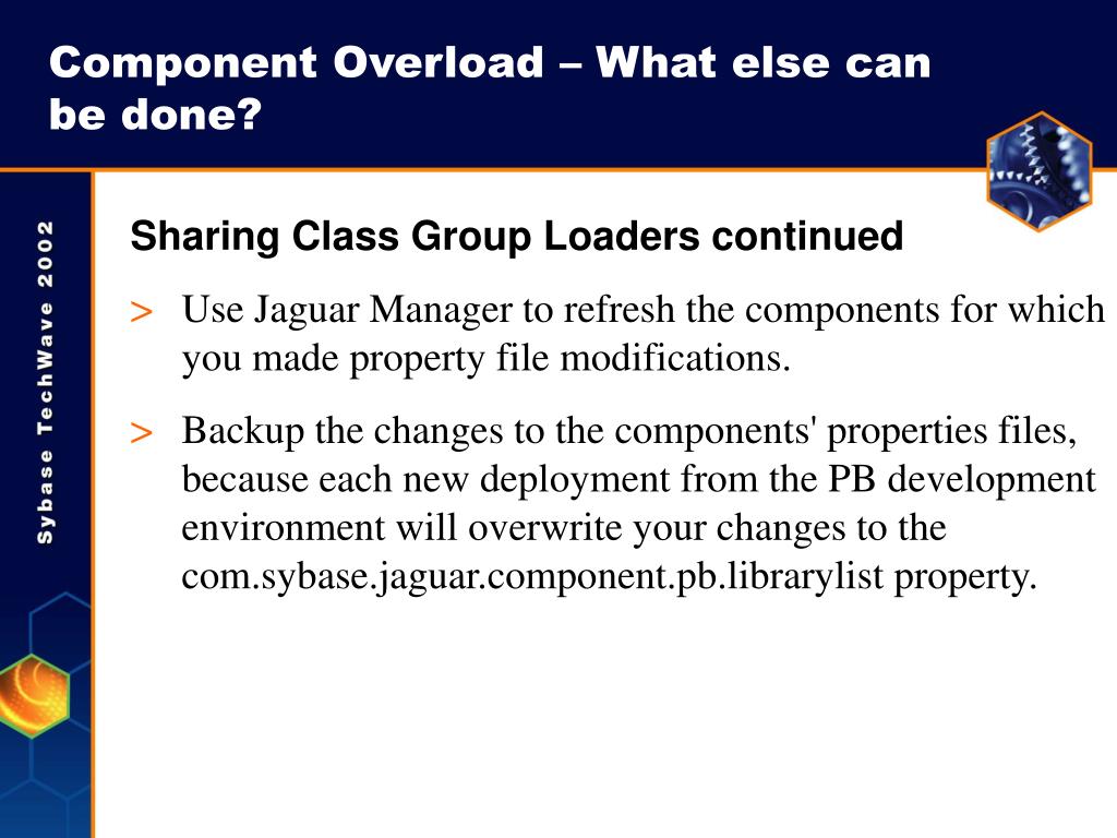 Component Overload – What else can be done? Sharing Class Group Loaders continued • Use Jaguar Manager to refresh the components for which you made property file modifications. • Backup the changes to the components' properties files, because each new deployment from the PB development environment will overwrite your changes to the com.sybase.jaguar.component.pb.librarylist property.