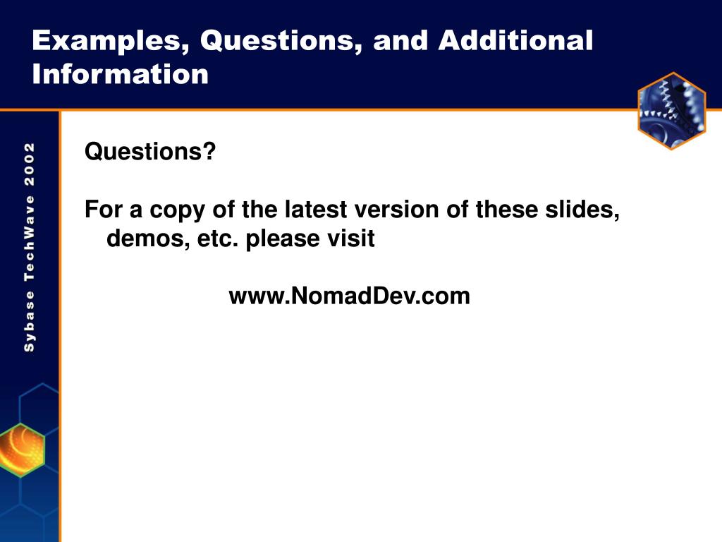 Examples, Questions, and Additional Information Questions? For a copy of the latest version of these slides, demos, etc. please visit www.NomadDev.com