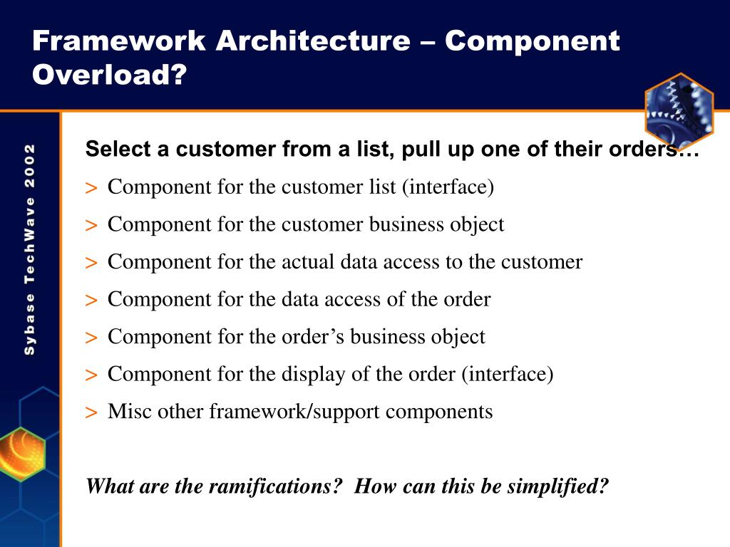 Framework Architecture – Component Overload? Select a customer from a list, pull up one of their orders… • Component for the customer list (interface) • Component for the customer business object • Component for the actual data access to the customer • Component for the data access of the order • Component for the order’s business object • Component for the display of the order (interface) • Misc other framework/support components What are the ramifications? How can this be simplified?