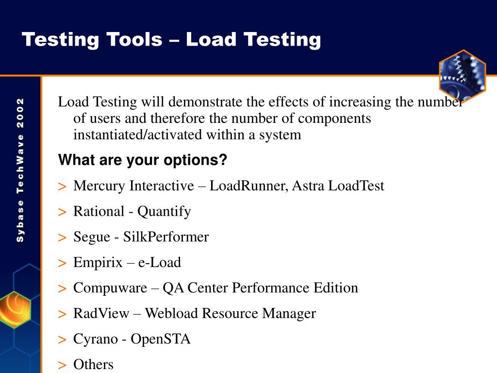Testing Tools – Load Testing Load Testing will demonstrate the effects of increasing the number of users and therefore the number of components instantiated/activated within a system What are your options? • Mercury Interactive – LoadRunner, Astra LoadTest • Rational - Quantify • Segue - SilkPerformer • Empirix – e-Load • Compuware – QA Center Performance Edition • RadView – Webload Resource Manager • Cyrano - OpenSTA • Others