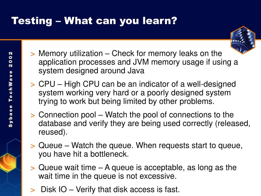 Testing – What can you learn? • Memory utilization – Check for memory leaks on the application processes and JVM memory usage if using a system designed around Java • CPU – High CPU can be an indicator of a well-designed system working very hard or a poorly designed system trying to work but being limited by other problems. • Connection pool – Watch the pool of connections to the database and verify they are being used correctly (released, reused). • Queue – Watch the queue. When requests start to queue, you have hit a bottleneck. • Queue wait time – A queue is acceptable, as long as the wait time in the queue is not excessive. • Disk IO – Verify that disk access is fast.