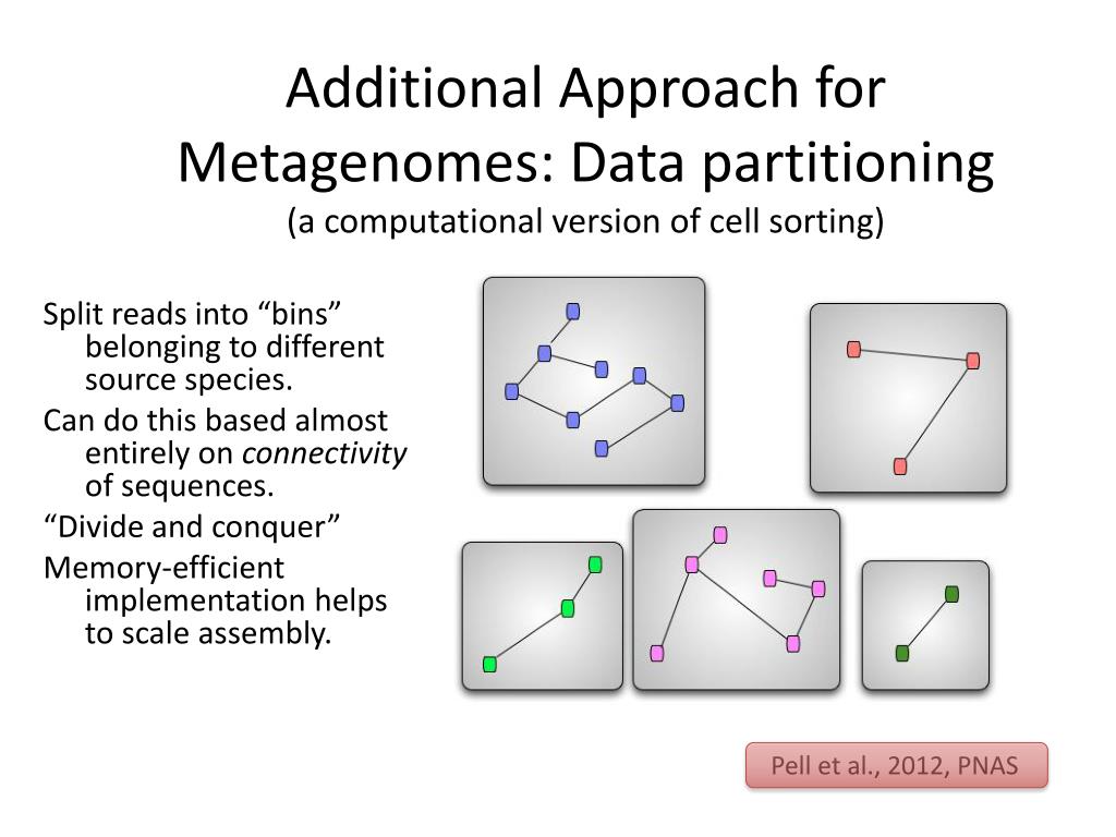 Additional Approach for Metagenomes: Data partitioning(a computational version of cell sorting) Split reads into “bins” belonging to different source species. Can do this based almost entirely on connectivity of sequences. “Divide and conquer” Memory-efficient implementation helps to scale assembly. Pell et al., 2012, PNAS