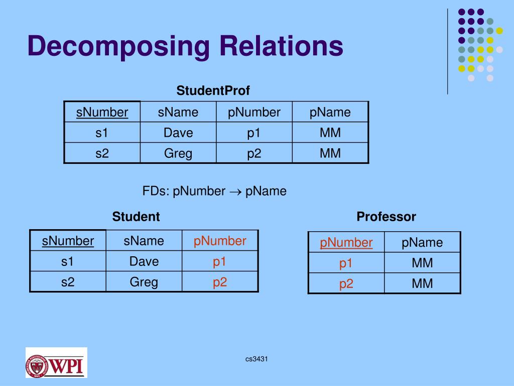 Decomposing Relations StudentProf FDs: pNumber pName Student Professor cs3431