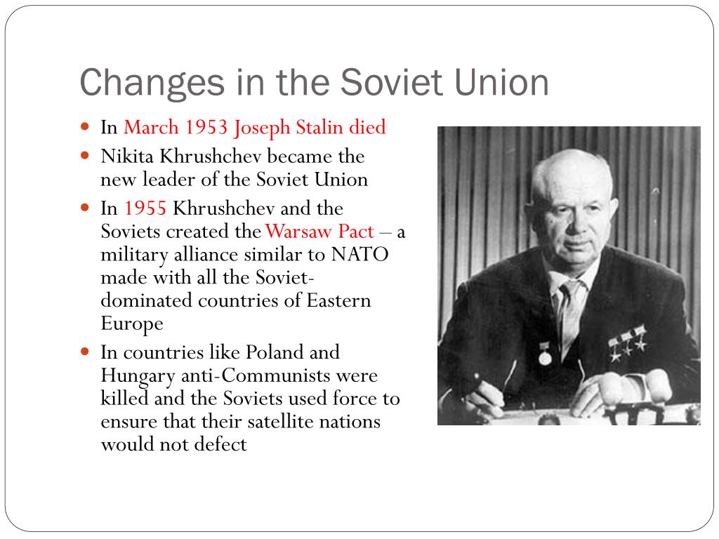 Changes in the Soviet Union • In March 1953 Joseph Stalin died • Nikita Khrushchev became the new leader of the Soviet Union • In 1955 Khrushchev and the Soviets created the Warsaw Pact – a military alliance similar to NATO made with all the Soviet-dominated countries of Eastern Europe • In countries like Poland and Hungary anti-Communists were killed and the Soviets used force to ensure that their satellite nations would not defect