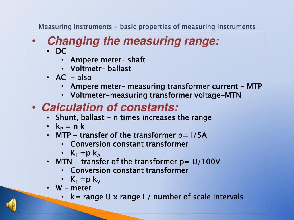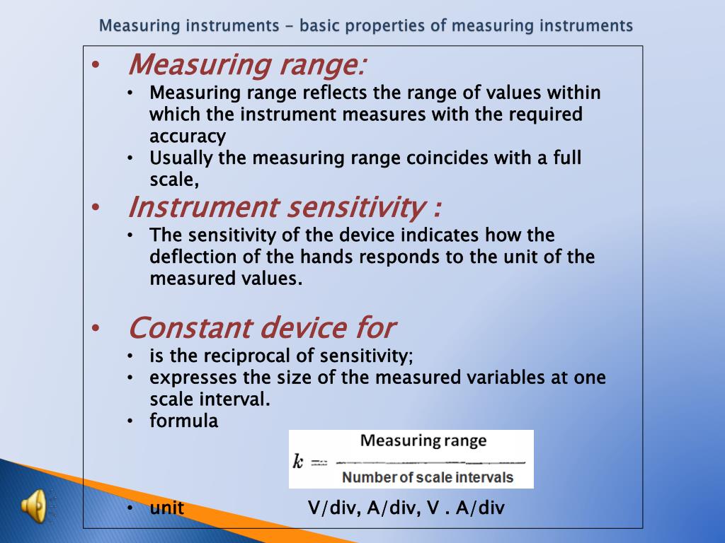Measuring instruments - basic properties of measuring instruments • Measuring range: • Measuring range reflects the range of values within which the instrument measures with the required accuracy • Usually the measuring range coincides with a full scale, • Instrument sensitivity : • The sensitivity of the device indicates how the deflection of the hands responds to the unit of the measured values. • Constant device for • is the reciprocal of sensitivity; • expresses the size of the measured variables at one scale interval. • formula • unit V/div, A/div, V . A/div