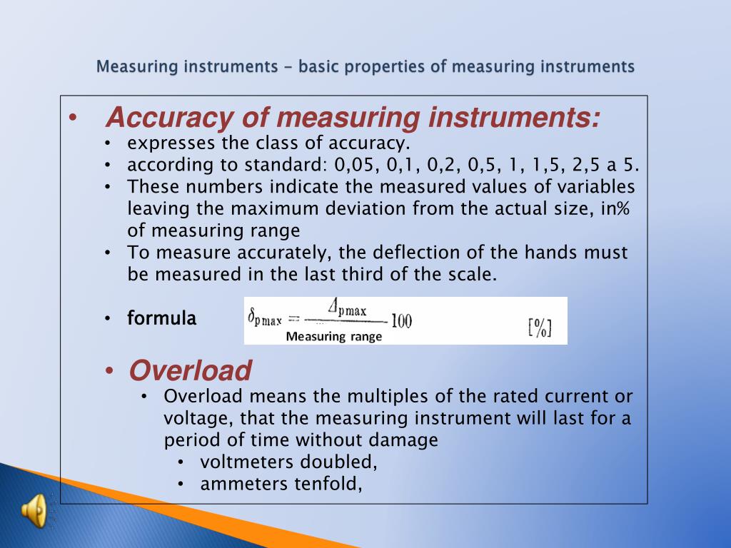 Measuring instruments - basic properties of measuring instruments • Accuracy of measuring instruments: • expresses the class of accuracy. • according to standard: 0,05, 0,1, 0,2, 0,5, 1, 1,5, 2,5 a 5. • These numbers indicate the measured values of variables leaving the maximum deviation from the actual size, in% of measuring range • To measure accurately, the deflection of the hands must be measured in the last third of the scale. • formula • Overload • Overload means the multiples of the rated current or voltage, that the measuring instrument will last for a period of time without damage • voltmeters doubled, • ammeters tenfold,