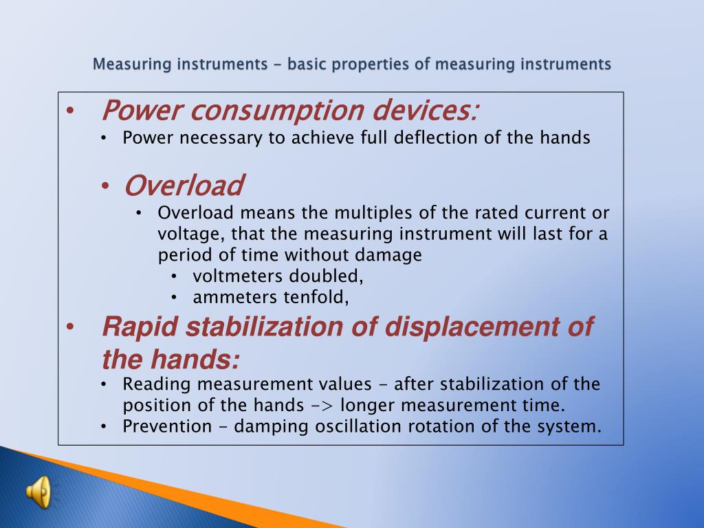 Measuring instruments - basic properties of measuring instruments • Power consumption devices: • Power necessary to achieve full deflection of the hands • Overload • Overload means the multiples of the rated current or voltage, that the measuring instrument will last for a period of time without damage • voltmeters doubled, • ammeters tenfold, • Rapid stabilization of displacement of the hands: • Reading measurement values - after stabilization of the position of the hands -> longer measurement time. • Prevention - damping oscillation rotation of the system.