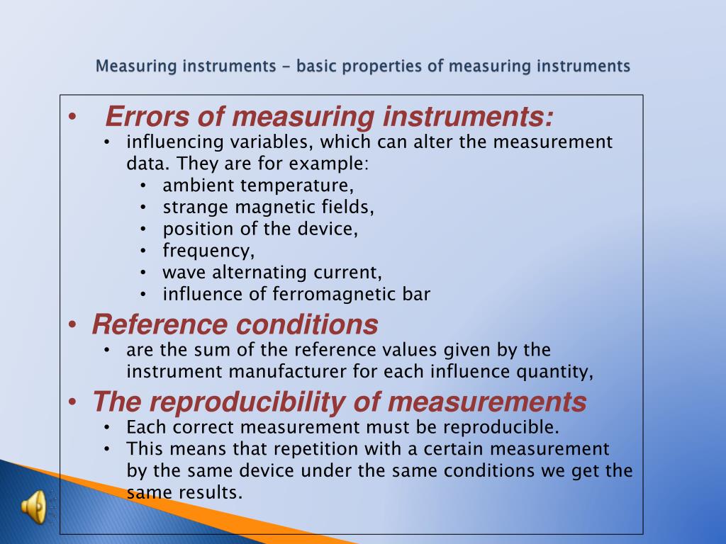 Measuring instruments - basic properties of measuring instruments • Errors of measuring instruments: • influencing variables, which can alter the measurement data. They are for example: • ambient temperature, • strange magnetic fields, • position of the device, • frequency, • wave alternating current, • influence of ferromagnetic bar • Reference conditions • are the sum of the reference values given by the instrument manufacturer for each influence quantity, • The reproducibility of measurements • Each correct measurement must be reproducible. • This means that repetition with a certain measurement by the same device under the same conditions we get the same results.
