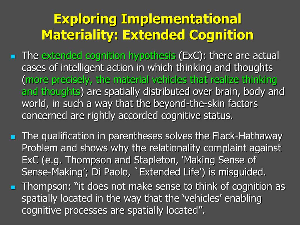 Exploring Implementational Materiality: Extended Cognition • The extended cognition hypothesis (ExC): there are actual cases of intelligent action in which thinking and thoughts (more precisely, the material vehicles that realize thinking and thoughts) are spatially distributed over brain, body and world, in such a way that the beyond-the-skin factors concerned are rightly accorded cognitive status. • The qualification in parentheses solves the Flack-Hathaway Problem and shows why the relationality complaint against ExC (e.g. Thompson and Stapleton, ‘Making Sense of Sense-Making’; Di Paolo, `Extended Life’) is misguided. • Thompson: “it does not make sense to think of cognition as spatially located in the way that the ‘vehicles’ enabling cognitive processes are spatially located”.