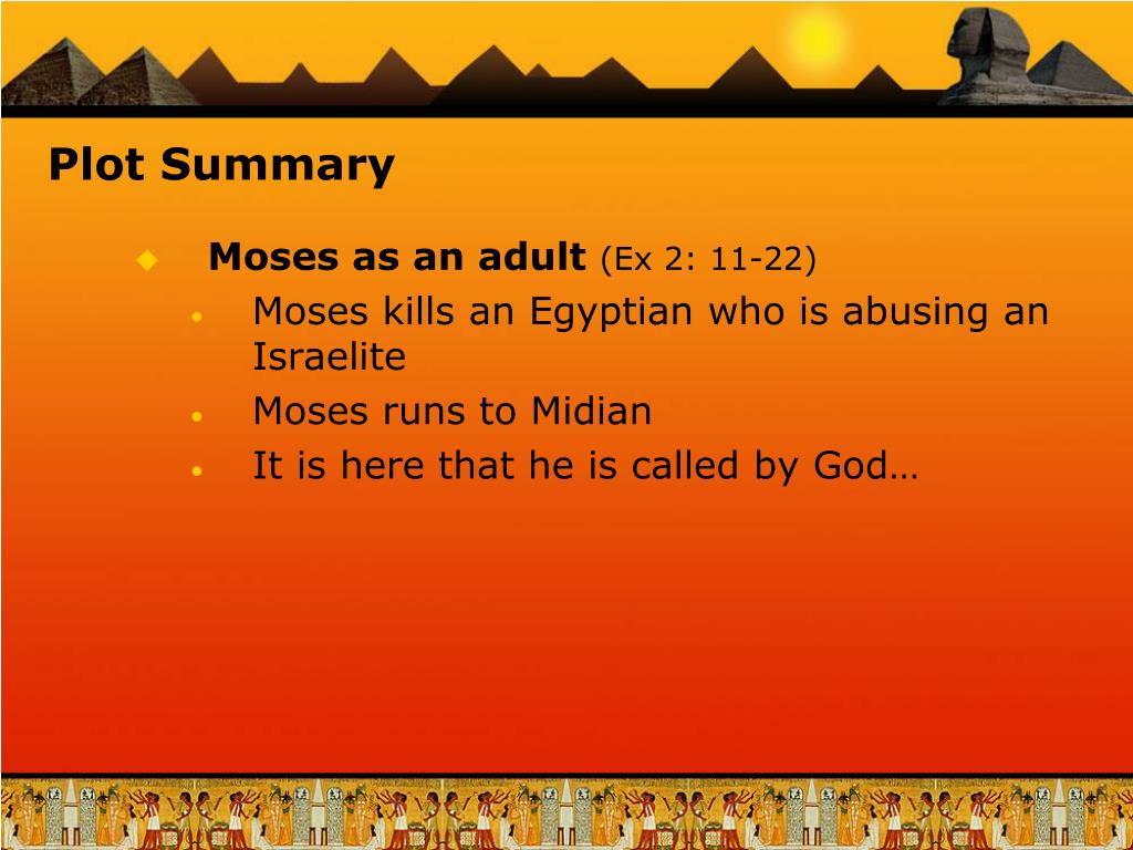 Plot Summary • Moses as an adult (Ex 2: 11-22) • Moses kills an Egyptian who is abusing an Israelite • Moses runs to Midian • It is here that he is called by God…