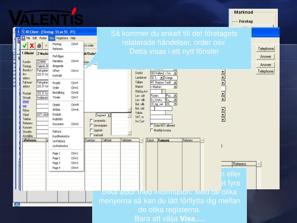 Företagsregister Med möjlighet att hålla reda på alla dina kontakter Information om Kundens objekt Försäljningsstatistik Referenser Avtalade kontrakt Spara generell och specifik information Historik och statistik Rabattmatris med olika variabler beroende på eventuella avtal eller kampanjer Så kommer du enkelt till det företagets relaterade händelser, order osv. Detta visas i ett nytt fönster Detta kallar vi listvyn. För enkelhetens skull så ser listvyn likadan ut i hela systemet. Här kan du enkelt söka, förändra eller göra urval. Eller varför inte köra aktivitet på ditt urval. Postvyn med information kring kunden eller leverantören. Du har i företagsregistret fyra olika sidor med information. Med de olika menyerna så kan du lätt förflytta dig mellan de olika registerna. Bara att välja Visa….