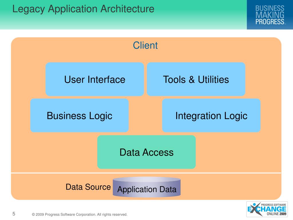 Legacy Application Architecture Client Tools & Utilities User Interface Business Logic Integration Logic Data Access Data Source Application Data