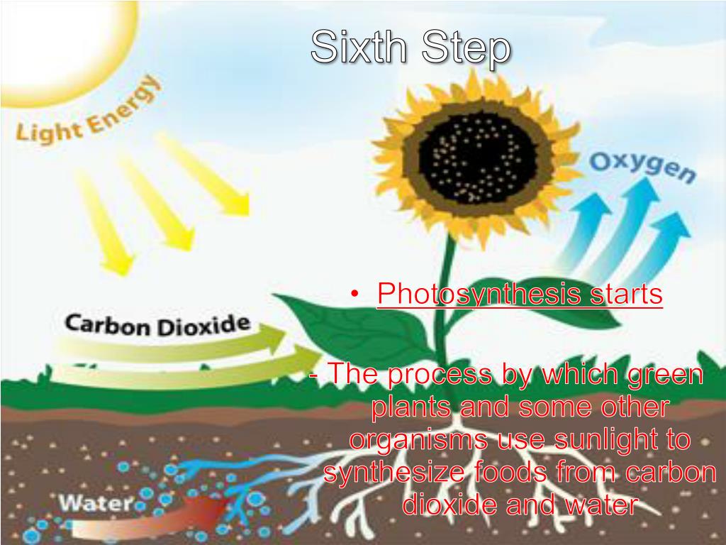 Sixth Step • Photosynthesis starts - The process by which green plants and some other organisms use sunlight to synthesize foods from carbon dioxide and water