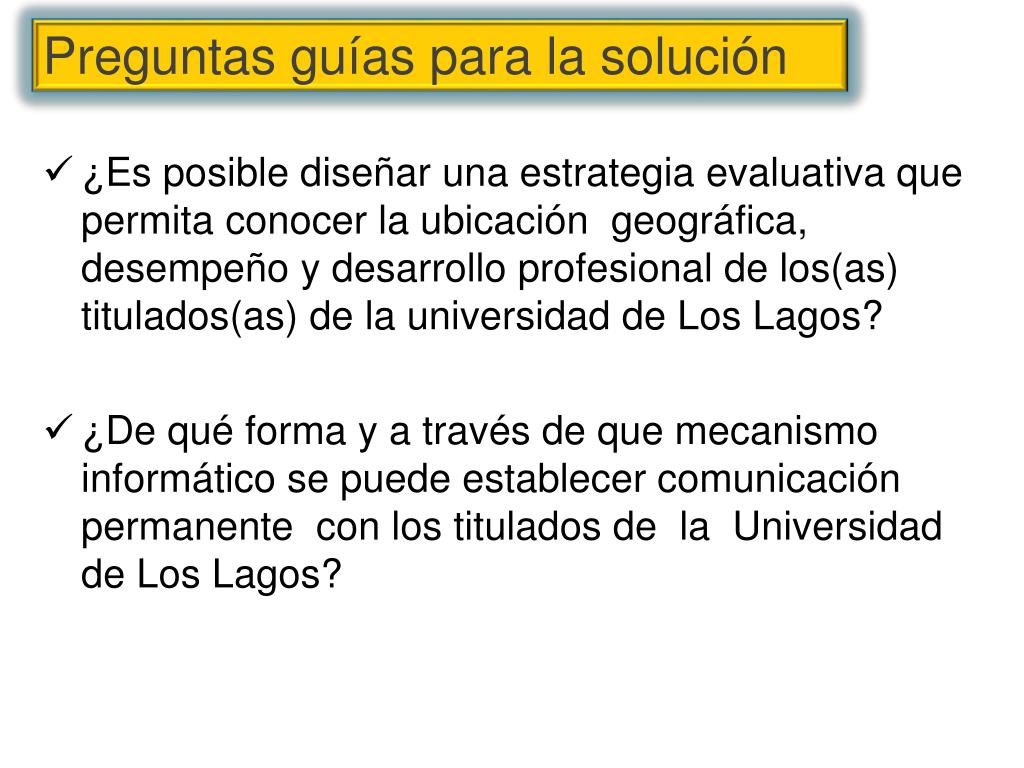 ¿Es posible diseñar una estrategia evaluativa que permita conocer la ubicación geográfica, desempeño y desarrollo profesional de los(as) titulados(as) de la universidad de Los Lagos? ¿De qué forma y a través de que mecanismo informático se puede establecer comunicación permanente con los titulados de la Universidad de Los Lagos? Preguntas guías para la solución