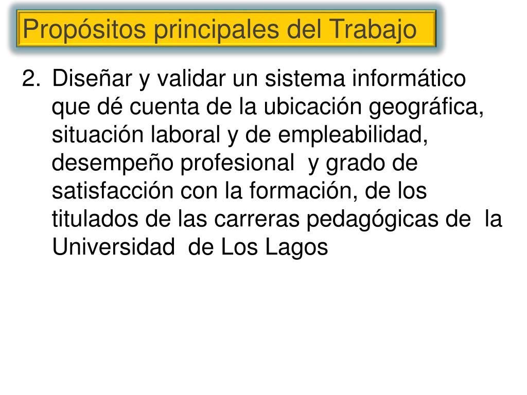 Diseñar y validar un sistema informático que dé cuenta de la ubicación geográfica, situación laboral y de empleabilidad, desempeño profesional y grado de satisfacción con la formación, de los titulados de las carreras pedagógicas de la Universidad de Los Lagos Propósitos principales del Trabajo