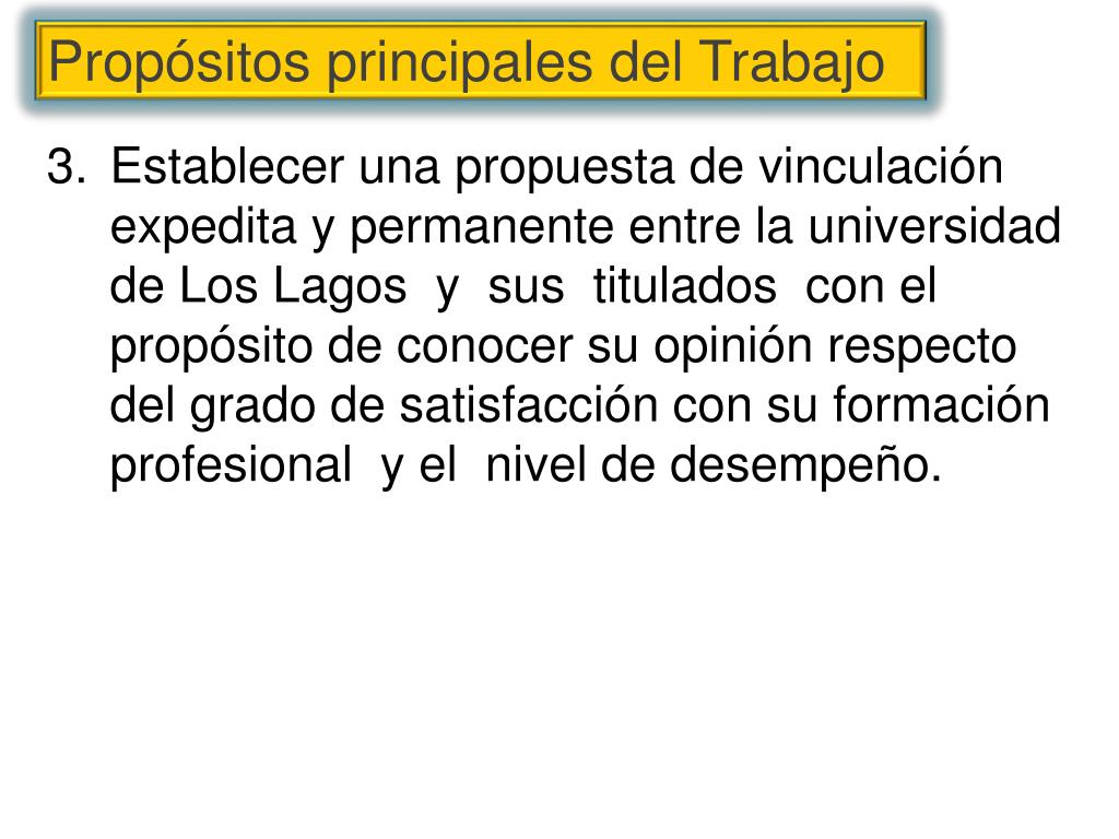 Establecer una propuesta de vinculación expedita y permanente entre la universidad de Los Lagos y sus titulados con el propósito de conocer su opinión respecto del grado de satisfacción con su formación profesional y el nivel de desempeño. Propósitos principales del Trabajo