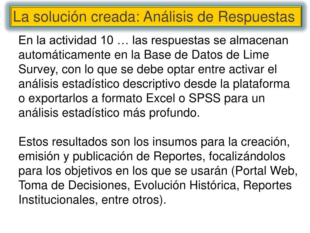 La solución creada: Análisis de Respuestas En la actividad 10 … las respuestas se almacenan automáticamente en la Base de Datos de Lime Survey, con lo que se debe optar entre activar el análisis estadístico descriptivo desde la plataforma o exportarlos a formato Excel o SPSS para un análisis estadístico más profundo. Estos resultados son los insumos para la creación, emisión y publicación de Reportes, focalizándolos para los objetivos en los que se usarán (Portal Web, Toma de Decisiones, Evolución Histórica, Reportes Institucionales, entre otros).
