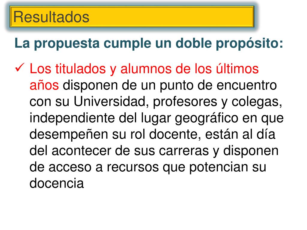 Resultados • La propuesta cumple un doble propósito: • Los titulados y alumnos de los últimos años disponen de un punto de encuentro con su Universidad, profesores y colegas, independiente del lugar geográfico en que desempeñen su rol docente, están al día del acontecer de sus carrerasy disponen de acceso a recursos que potencian su docencia