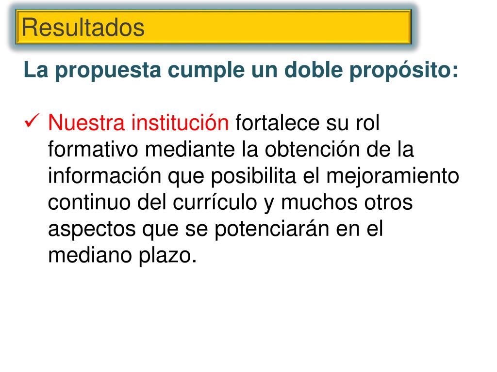 Resultados • La propuesta cumple un doble propósito: • Nuestra institución fortalece su rol formativo mediante la obtención de la información que posibilita el mejoramiento continuo del currículo y muchos otros aspectos que se potenciarán en el mediano plazo.