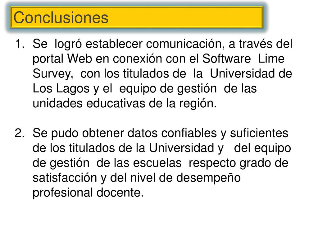 Conclusiones • Se logró establecer comunicación, a través del portal Web en conexión con el Software Lime Survey, con los titulados de la Universidad de Los Lagos y el equipo de gestión de las unidades educativas de la región. • Se pudo obtener datos confiables y suficientes de los titulados de la Universidad y del equipo de gestión de las escuelas respecto grado de satisfacción y del nivel de desempeño profesional docente.
