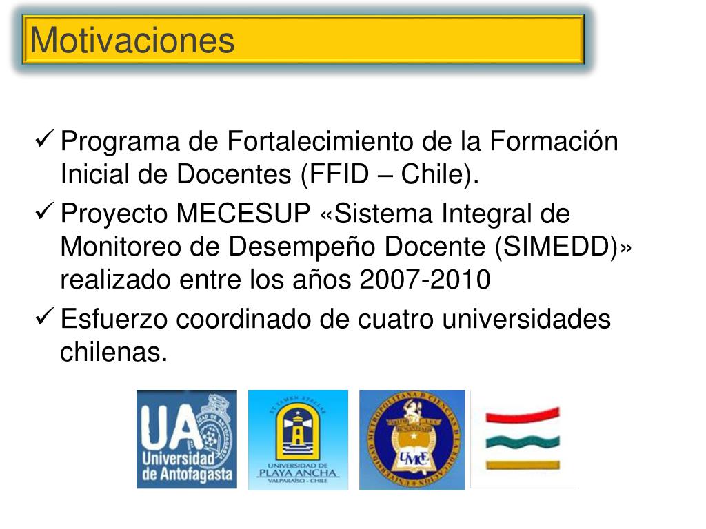 Programa de Fortalecimiento de la Formación Inicial de Docentes (FFID – Chile). Proyecto MECESUP «Sistema Integral de Monitoreo de Desempeño Docente (SIMEDD)» realizado entre los años 2007-2010 Esfuerzo coordinado de cuatro universidades chilenas. Motivaciones