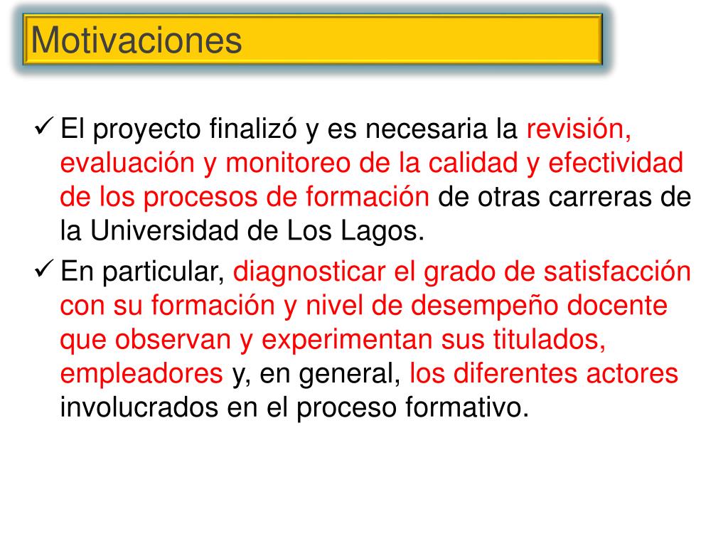 El proyecto finalizó y es necesaria la revisión, evaluación y monitoreo de la calidad y efectividad de los procesos de formación de otras carreras de la Universidad de Los Lagos. En particular, diagnosticar el grado de satisfacción con su formación y nivel de desempeño docente que observan y experimentan sus titulados, empleadores y, en general, los diferentes actores involucrados en el proceso formativo. Motivaciones