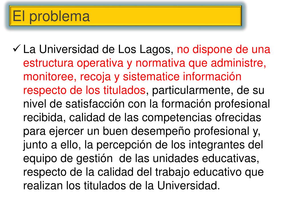 La Universidad de Los Lagos, no dispone de una estructura operativa y normativa que administre, monitoree, recoja y sistematice información respecto de los titulados, particularmente, de su nivel de satisfacción con la formación profesional recibida, calidad de las competencias ofrecidas para ejercer un buen desempeño profesional y, junto a ello, la percepción de los integrantes del equipo de gestión de las unidades educativas, respecto de la calidad del trabajo educativo que realizan los titulados de la Universidad. El problema
