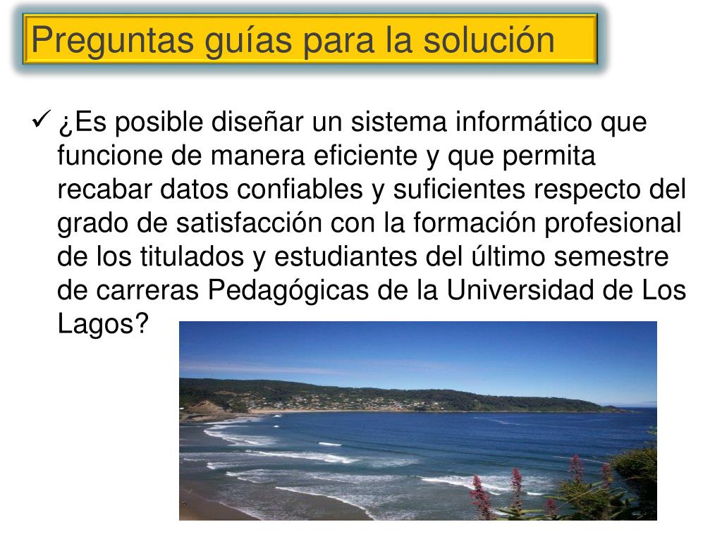 ¿Es posible diseñar un sistema informático que funcione de manera eficiente y que permita recabar datos confiables y suficientes respecto del grado de satisfacción con la formación profesional de los titulados y estudiantes del último semestre de carreras Pedagógicas de la Universidad de Los Lagos? Preguntas guías para la solución