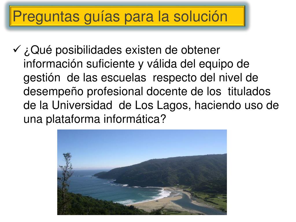 ¿Qué posibilidades existen de obtener información suficiente y válida del equipo de gestión de las escuelas respecto del nivel de desempeño profesional docente de los titulados de la Universidad de Los Lagos, haciendo uso de una plataforma informática? Preguntas guías para la solución