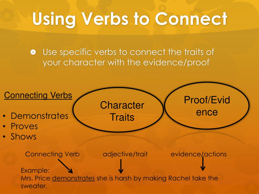 Using Verbs to Connect • Use specific verbs to connect the traits of your character with the evidence/proof • Connecting Verbs • Demonstrates • Proves • Shows Proof/Evidence Character Traits Connecting Verb adjective/trait evidence/actions Example: Mrs. Price demonstrates she is harsh by making Rachel take the sweater.