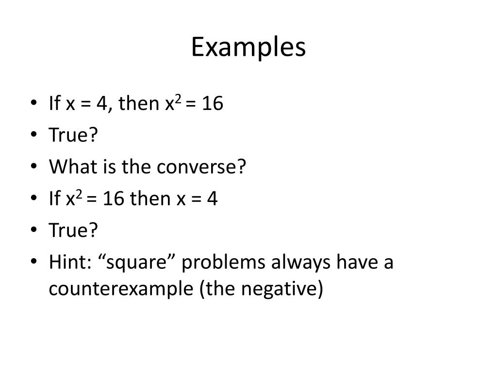 Examples • If x = 4, then x2 = 16 • True? • What is the converse? • If x2 = 16 then x = 4 • True? • Hint: “square” problems always have a counterexample (the negative)