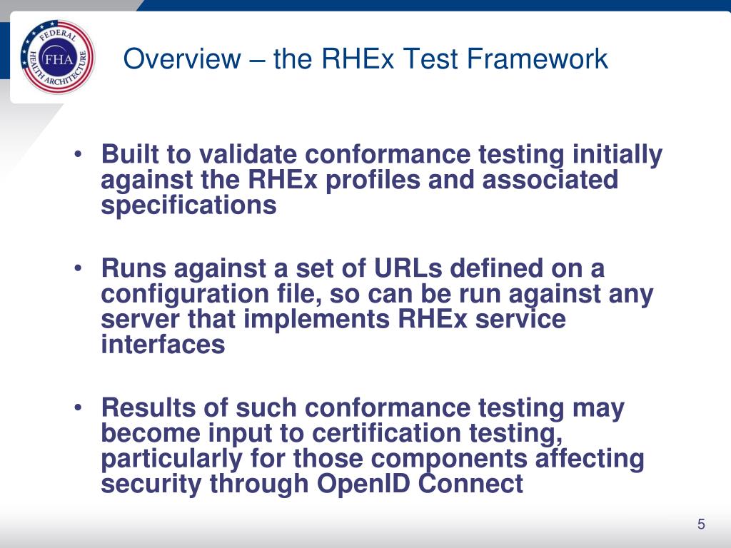 Overview – the RHEx Test Framework • Built to validate conformance testing initially against the RHEx profiles and associated specifications • Runs against a set of URLs defined on a configuration file, so can be run against any server that implements RHEx service interfaces • Results of such conformance testing may become input to certification testing, particularly for those components affecting security through OpenIDConnect