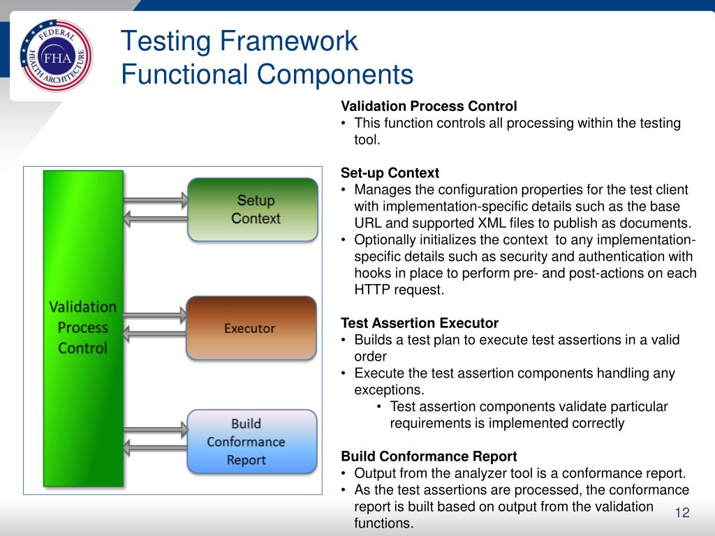 Testing FrameworkFunctional Components • Validation Process Control • This function controls all processing within the testing tool. • Set-up Context • Manages the configuration properties for the test client with implementation-specific details such as the base URL and supported XML files to publish as documents. • Optionally initializes the context to any implementation-specific details such as security and authentication with hooks in place to perform pre- and post-actions on each HTTP request. • Test Assertion Executor • Builds a test plan to execute test assertions in a valid order • Execute the test assertion components handling any exceptions. • Test assertion components validate particular requirements is implemented correctly • Build Conformance Report • Output from the analyzer tool is a conformance report. • As the test assertions are processed, the conformance report is built based on output from the validation functions.