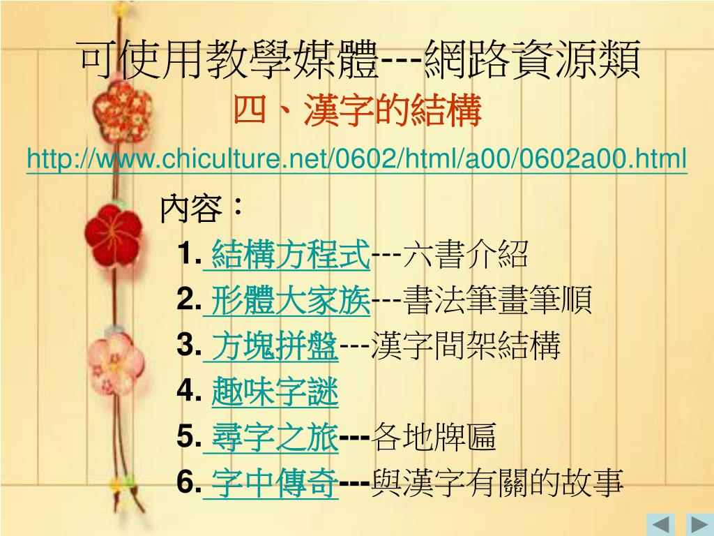 四、漢字的結構http://www.chiculture.net/0602/html/a00/0602a00.html四、漢字的結構http://www.chiculture.net/0602/html/a00/0602a00.html 可使用教學媒體---網路資源類 內容: 1.結構方程式---六書介紹 2.形體大家族---書法筆畫筆順 3.方塊拼盤---漢字間架結構 4. 趣味字謎 5.尋字之旅---各地牌匾 6.字中傳奇---與漢字有關的故事