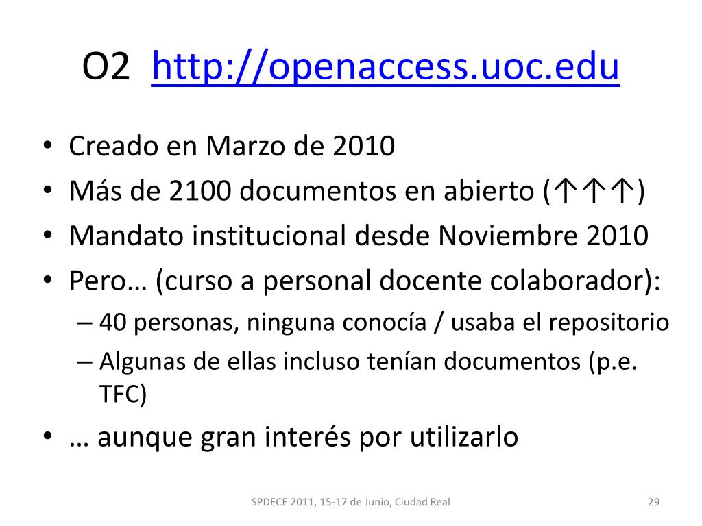 O2 http://openaccess.uoc.edu • Creado en Marzo de 2010 • Más de 2100 documentos en abierto (↑↑↑) • Mandato institucional desde Noviembre 2010 • Pero… (curso a personal docente colaborador): • 40 personas, ninguna conocía / usaba el repositorio • Algunas de ellas incluso tenían documentos (p.e. TFC) • … aunque gran interés por utilizarlo SPDECE 2011, 15-17 de Junio, Ciudad Real
