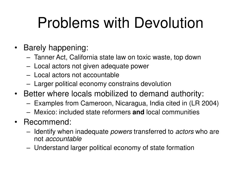 Problems with Devolution • Barely happening: • Tanner Act, California state law on toxic waste, top down • Local actors not given adequate power • Local actors not accountable • Larger political economy constrains devolution • Better where locals mobilized to demand authority: • Examples from Cameroon, Nicaragua, India cited in (LR 2004) • Mexico: included state reformers and local communities • Recommend: • Identify when inadequate powers transferred to actors who are not accountable • Understand larger political economy of state formation