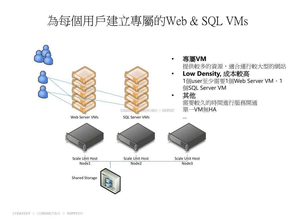 為每個用戶建立專屬的Web & SQL VMs • 專屬VM提供較多的資源,適合運行較大型的網站 • Low Density, 成本較高1個user至少需要1個Web Server VM,1個SQLServer VM • 其他需要較久的時間進行服務開通單一VM無HA… Web Server VMs SQLServer VMs Shared Storage Scale Unit Host Node1 Scale Unit Host Node2 Scale Unit Host Node3