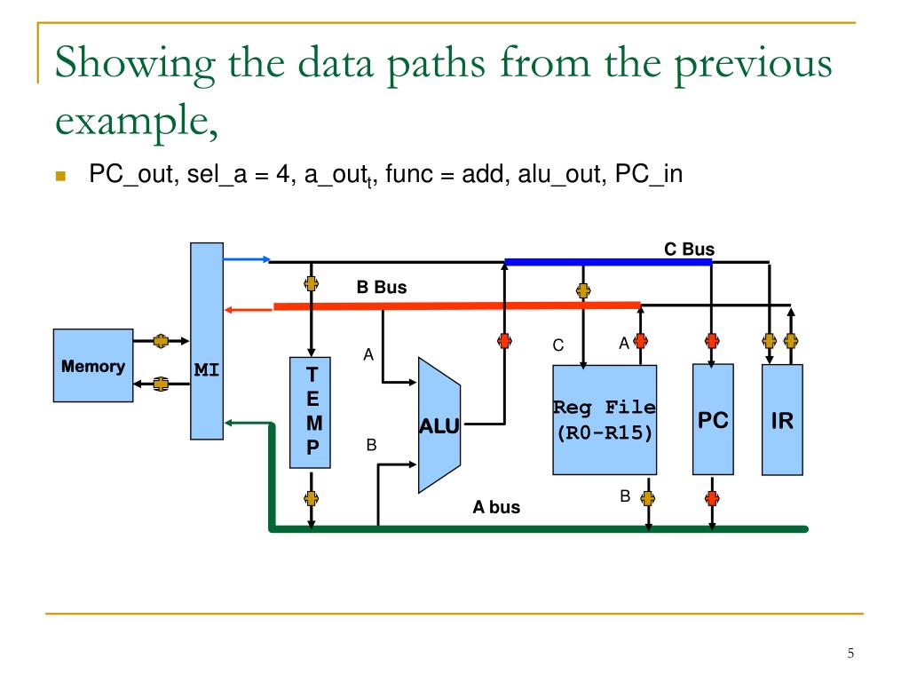 C Bus B Bus Memory A C A MI TEMP PC IR Reg File (R0-R15) ALU B B A bus Showing the data paths from the previous example, • PC_out, sel_a = 4, a_outt, func = add, alu_out, PC_in