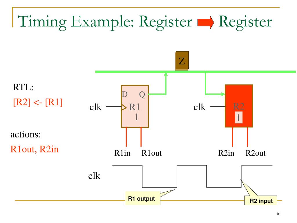 Z 1 Z R1 D Q R2 R2 D Q clk clk 1 0 1 R1in R1out R2in R2out R1out, R2in clk Timing Example: Register Register RTL: [R2] <- [R1] actions: R1 output R2 input