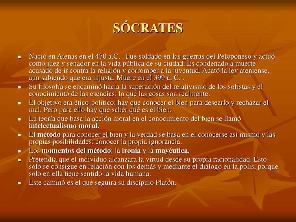 SÓCRATES • Nació en Atenas en el 470 a.C. . Fue soldado en las guerras del Peloponeso y actuó como juez y senador en la vida pública de su ciudad. Es condenado a muerte acusado de ir contra la religión y corromper a la juventud. Acató la ley ateniense, aun sabiendo que era injusta. Muere en el 399 a. C. . • Su filosofía se encaminó hacia la superación del relativismo de los sofistas y el conocimiento de las esencias: lo que las cosas son realmente. • El objetivo era ético-político: hay que conocer el bien para desearlo y rechazar el mal. Pero para ello hay que saber qué es el bien. • La teoría que basa la acción moral en el conocimiento del bien se llamó intelectualismo moral. • El método para conocer el bien y la verdad se basa en el conocerse así mismo y las propias posibilidades: conocer la propia ignorancia. • Los momentos del método: la ironía y la mayéutica. • Pretendía que el individuo alcanzara la virtud desde su propia racionalidad. Esto solo se consigue en relación con los demás y mediante el diálogo en la polis, porque solo en ella tiene sentido la vida humana. • Este caminó es el que seguira su discípulo Platón.
