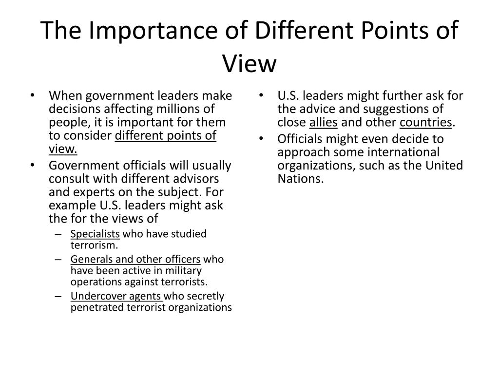 The Importance of Different Points of View • When government leaders make decisions affecting millions of people, it is important for them to consider different points of view. • Government officials will usually consult with different advisors and experts on the subject. For example U.S. leaders might ask the for the views of • Specialists who have studied terrorism. • Generals and other officers who have been active in military operations against terrorists. • Undercover agents who secretly penetrated terrorist organizations • U.S. leaders might further ask for the advice and suggestions of close allies and other countries. • Officials might even decide to approach some international organizations, such as the United Nations.